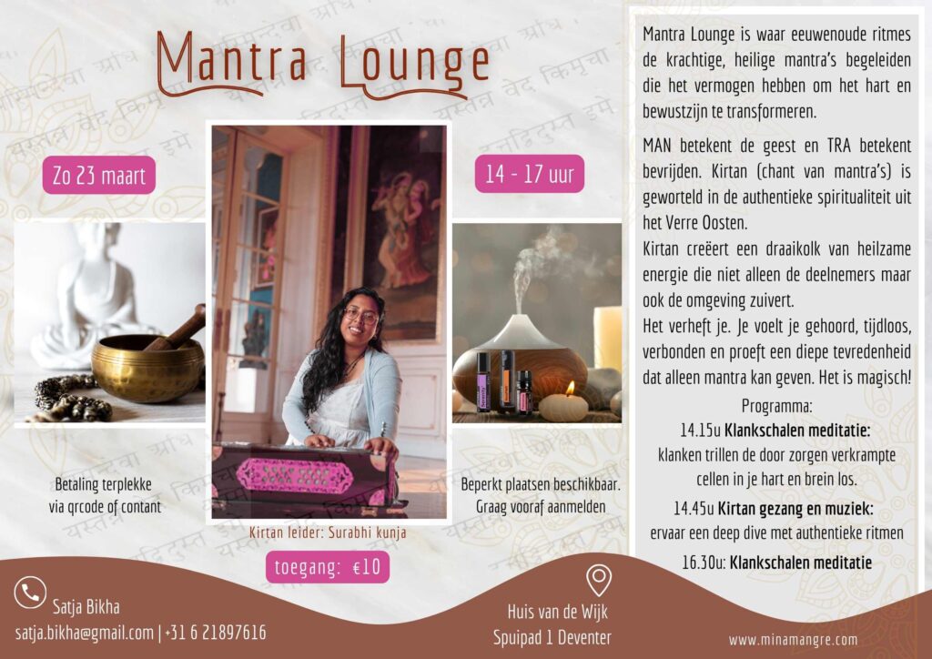 De volgende MANTRA LOUNGE hebben we op 23 naart van 14-17uur in Deventer. Toegangsprijs per deelnemer: 10 Euro.